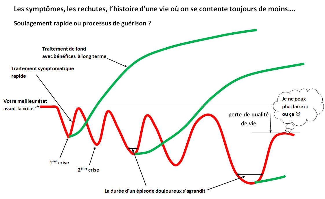 La médecine d'aujourd'hui a fait des progrès immenses dans les soins aigus, pour sauver des vies dans l'instant. Pour mention, il suffit de voir les progrès en médecine cardiaque, en traumatologie, en orthopédie et bien d'autres. Elle reste cependant très limitées lorsqu'il s'agit de problèmes chroniques. Pourquoi cela, me demanderez-vous ?La médecine est dans un modèle de restauration. Les soins dispensés vont ramener la personne dans le même état qu'avant la maladie. Les symptômes sont vus comme étant des interférences dont il faut se débarrasser au plus vite.Une fois ramené(e) à l'état de départ, vous êtes destiné(e) à dévaler la même pente, à arriver au même résultat, si vous ne changez pas votre fonctionnement.